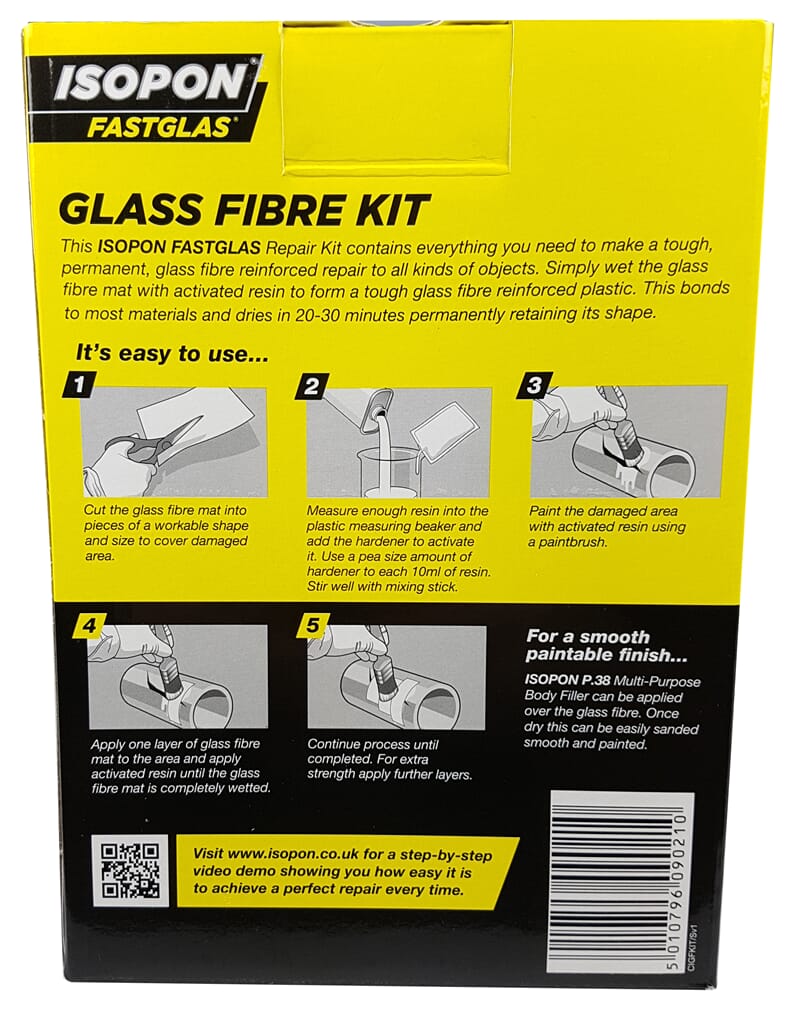 Hurtigherdende flytende polyester, målekopp, glassfibermatte, rørepinne, herder, pensel og hansker. Fastglas glassfiber er meget sterkt og værbestandig.